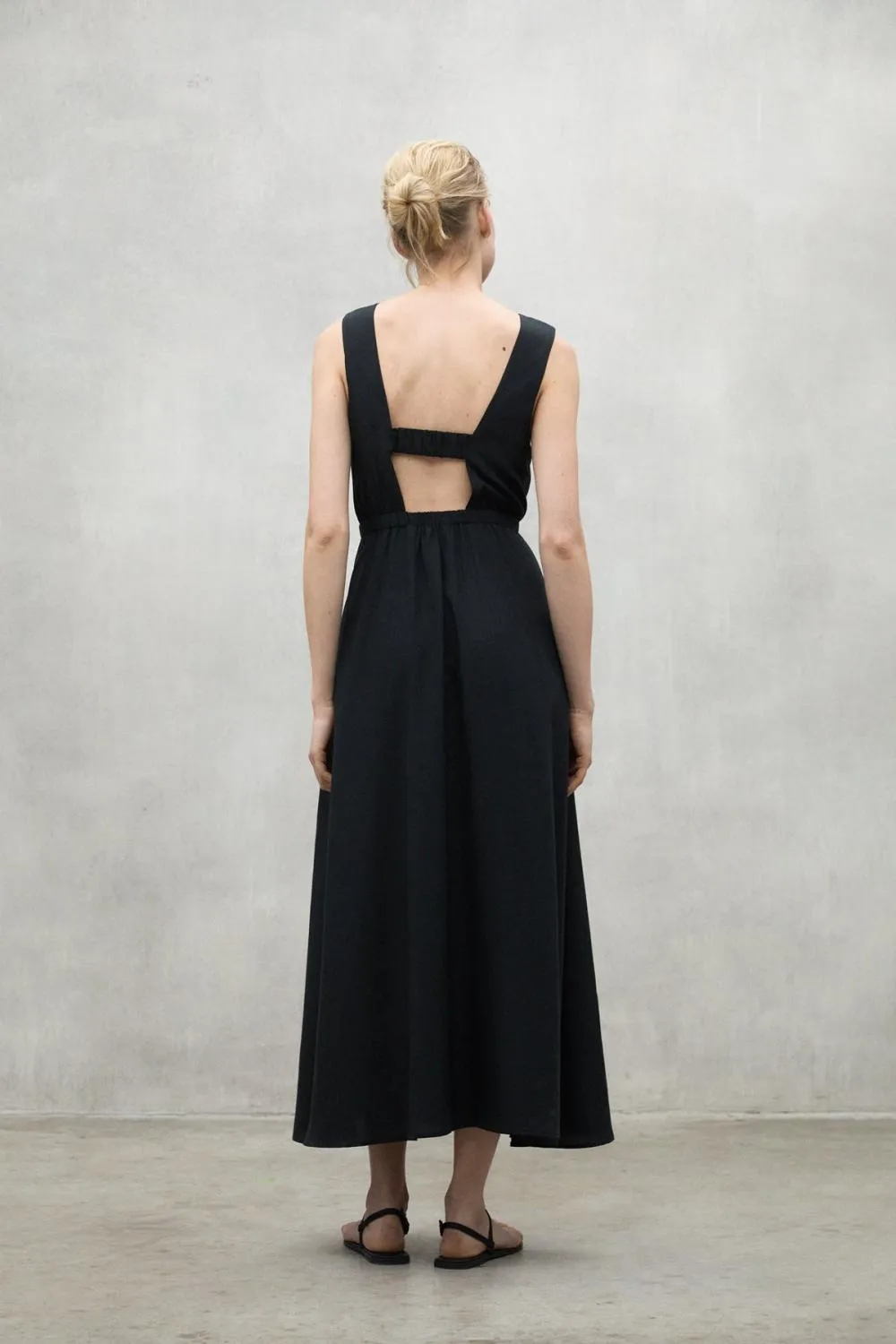Obleka je pravilnega kroja in ima eleganten okrogel izrez, ki ji daje brezčasen videz. Oblazinjenje v pasu poudari silhueto, odprt hrbet z elastičnim trakom pa obleki doda prefinjen element. S stranskimi všitimi žepi združuje praktičnost z eleganco.