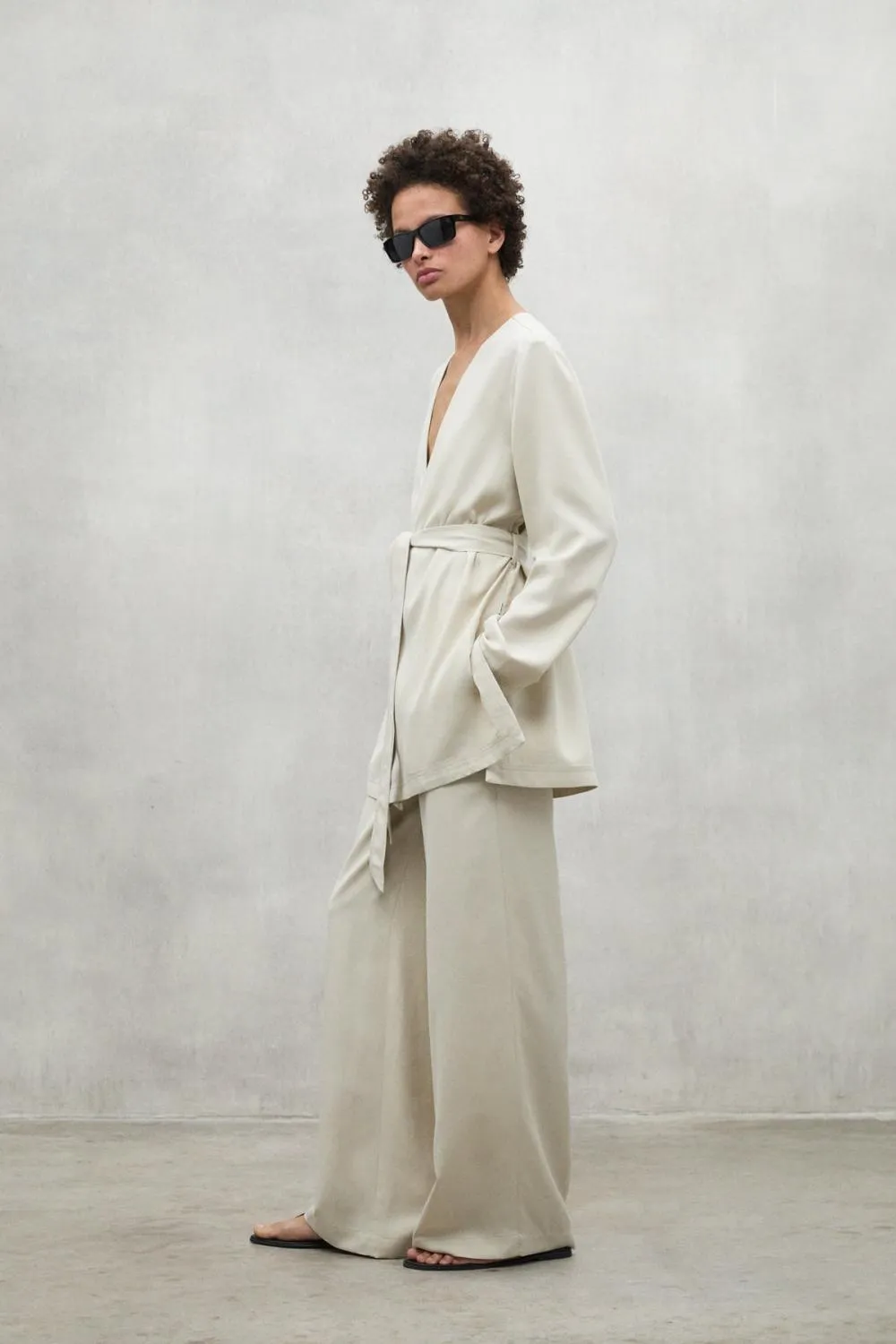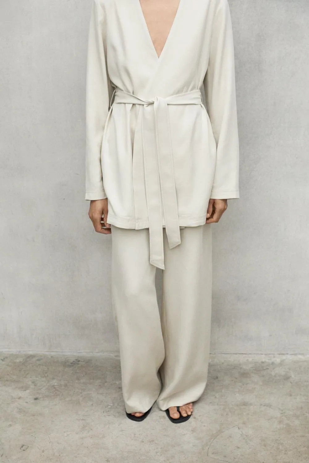 Platno Tana ima ohlapen kroj, ki omogoča udobno plastenje in prilagajanje različnim stilom. Izrez v obliki črke V jakni doda prefinjen videz, pas iz blaga pa omogoča, da po potrebi prilagodite pas in poudarite silhueto.