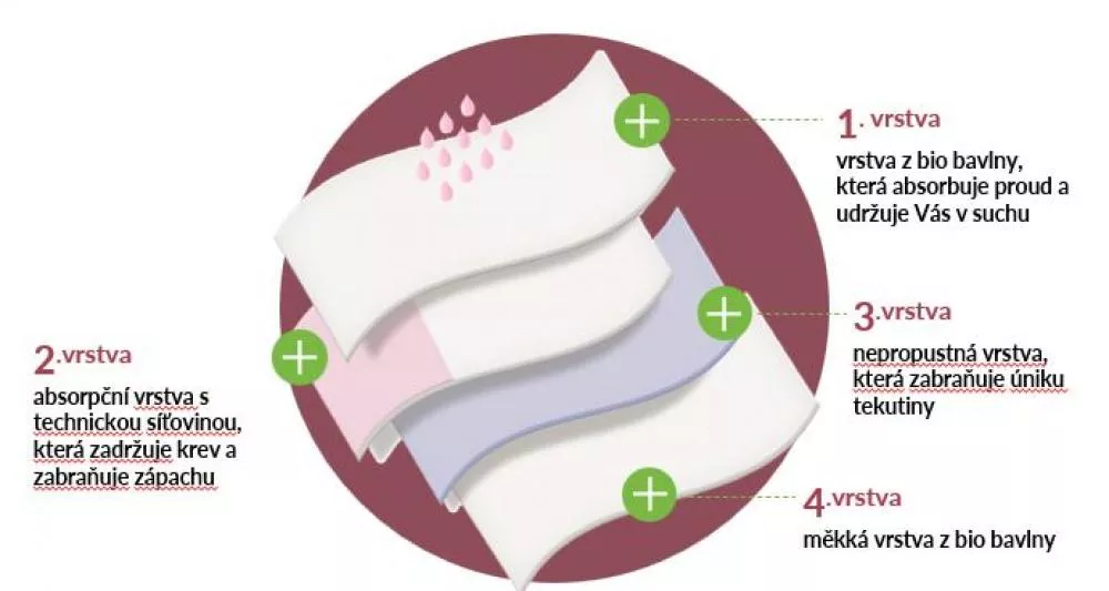 Sestava menstrualnih hlačk vsebuje vpojno plast iz tehnične mreže, ki zadržuje kri in vonj.