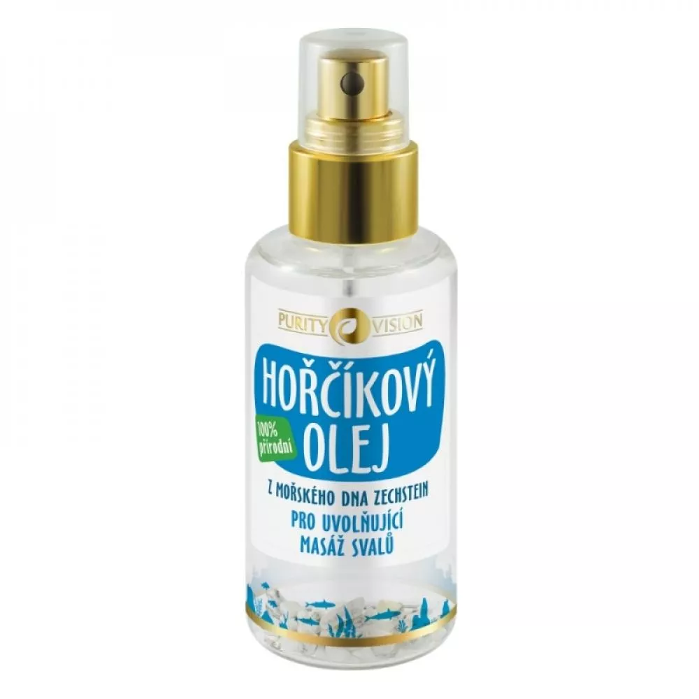 Magnezijevo olje PURITY VISION® je 100% naravno masažno sredstvo za sprostitev in razbremenitev ne le utrujenih mišic. Pridobiva se iz magnezijevih soli, ki so se naložile na dnu tako imenovanega Zechsteinskega morja, ki je označeno kot najčistejši vir magnezija na svetu. Tako kot morska voda, Magnezijevo olje pomaga pri hidraciji kože in zahvaljujoč raztopljeni magnezijevi soli podpira naravno zaščitno pregrado kože, hidrira in spodbuja regeneracijo kožnih celic.