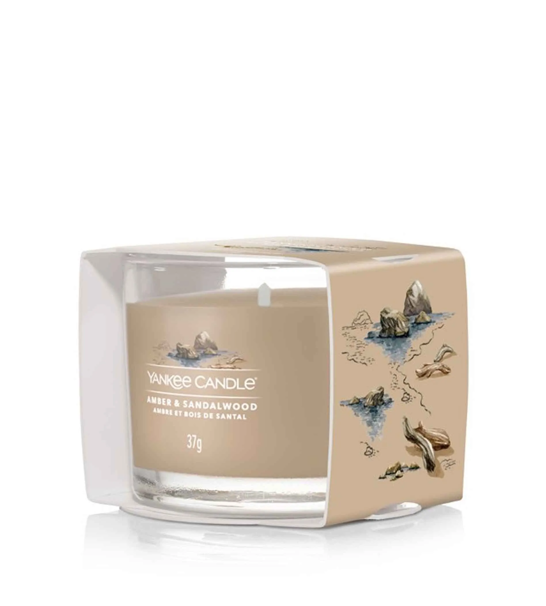 Opis izdelka Yankee Candle Amber & Sandalwood votivna sveča v steklu za moške